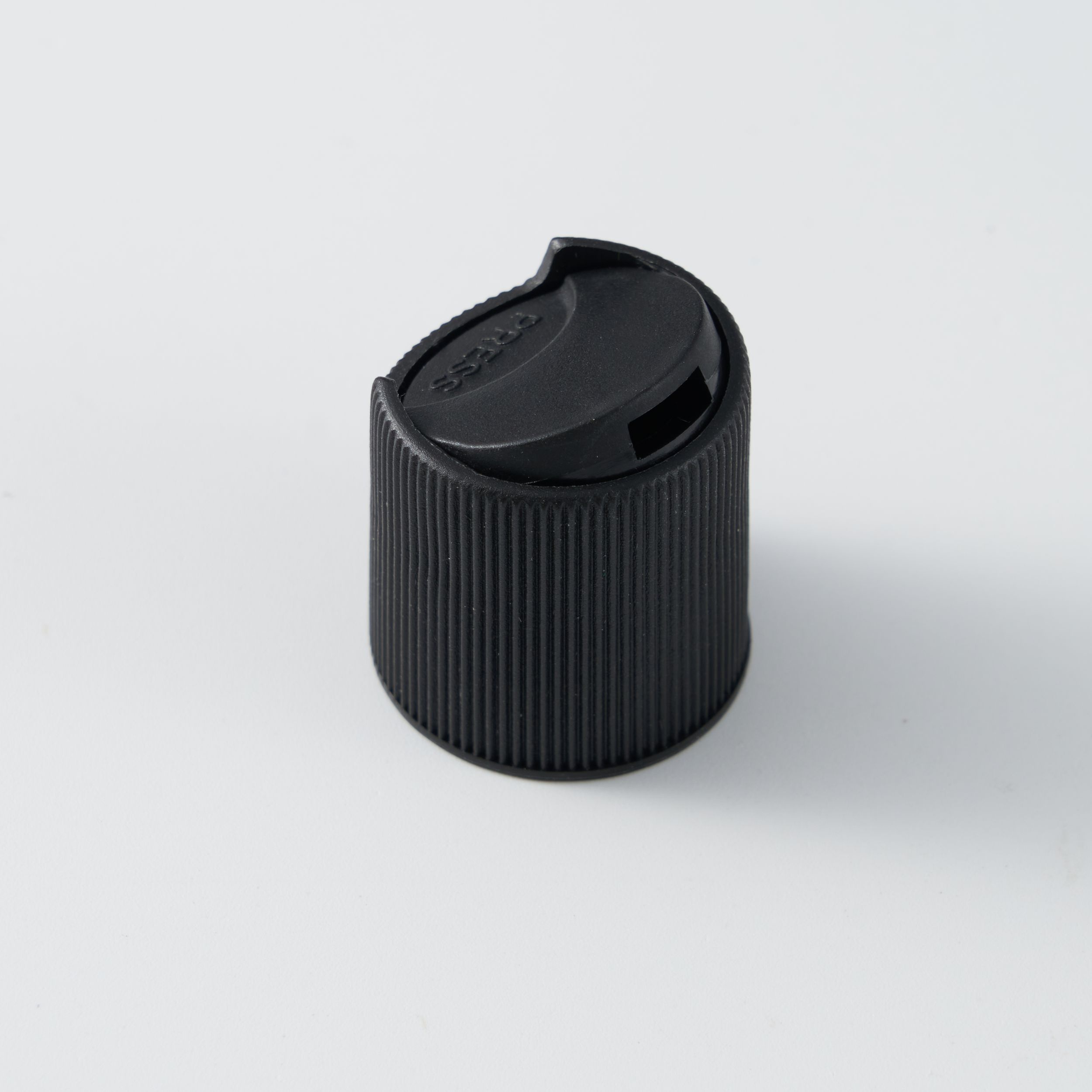 20-410 White Ribbed Disc Top Cap. This dispensing cap is made out of polypropylene plastic and has a ribbed side, a matte side and a smooth top. This gives it a sleek, high-end appearance that is perfect for cosmetic products or bath and body products. On the top, it has a slight indent and the writing "PRESS". When it is pressed, the other side of the cap pops open, allowing for the product inside the container to be dispensed. This cap has no liner on the inside, but when the top is closed it will stop leaks. It has an orifice size of 5.8 mm and is a great cap to dispense thin liquids like sauces, lotions, skin or body care products, and personal care products. This cap fits on a container with a 24 mm and 20 mm opening and a 410 and 415 neck finish and can be paired with any of the matching containers below.